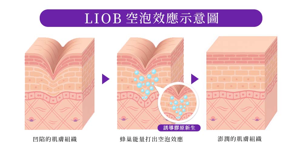 蜂巢瞬效透鏡將皮秒脈衝聚焦於真皮層,形成雷射誘發光學擊穿(LIOB, Laser-Induced Optical Breakdown),在皮膚深層產生許多微小「空泡」。這些空泡不會破壞表皮,卻能啟動肌膚的自我修復機制,促進膠原蛋白與彈力纖維新生,因此對於凹疤、毛孔與紋理特別有感。